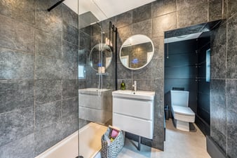The pathway takes you up to the front door where you enter the living room boasting a feature brick fireplace with log burner and being the heart of this much loved home. From here you step into a good size kitchen/diner benefitting from a range of attractive wall and base units and ample work surface areas. There is also a built-in oven and hob. The room has plenty of space for a table and chairs. The room open up into a very useful utility area with space for a fridge/freezer and washing machine both to remain. From here you enter a superb newly fitted modern contemporary bathroom being fully tiled and with a walk-in shower, WC and wash hand basin with vanity unit below.