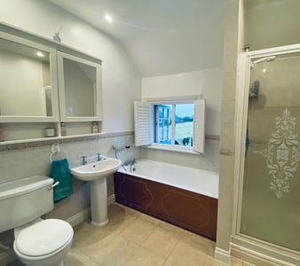 Window to rear. Fully tiled corner shower cubicle. Wall mounted gravity shower unit. Panelled bath. Wash basin and WC to match. Wall mounted toiletries cupboard. Radiator.