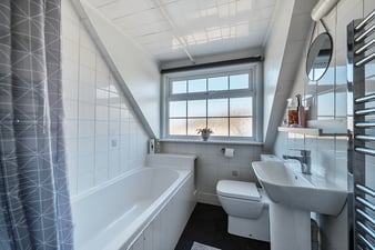 Window to side. Tiled effect flooring. Three piece bathroom suite comprising a panelled bath with wall mounted gravity shower unit. WC and wash basin to match. Wall mounted chrome ladder style radiator.