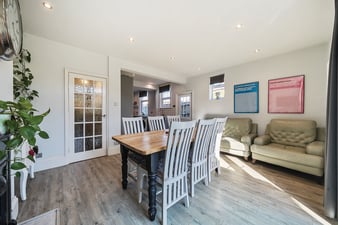 Fully glazed patio doors opening out onto rear patio. Karndean flooring. Feature period fireplace. Wall mounted ladder contemporary style radiator.