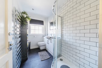 Window to side. Tiled effect flooring. Fully tiled shower cubicle with wall mounted gravity shower unit. Partially integrated wash basin with built-in vanity cupboards below and flat surface above. WC with concealed flush. Large wall mounted chrome ladder style radiator.