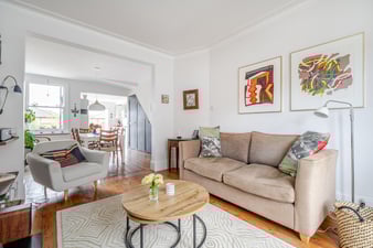 Large bespoke bay windows to the front. An eco friendly feature wood burning stove with a slate hearth. Recessed shelving to both sides. Built-in cupboard housing electric meters. Additional cupboard for storage, Wooden flooring. Open plan through to dining room.