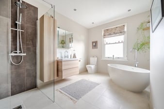 Window to the rear. Tiled flooring. A beautifully arranged room with a deluxe fully tiled corner double shower unit with a wall mounted gravity 'rain shower' style shower. Fully integrated large sink unit with drawers below for storage. A wall mounted vanity unit with an LED mirror face. Large stand alone 'roll top bath' with superior chrome contemporary design mixer taps and hand shower unit. LED ceiling spotlights. Wall mounted chrome ladder towel rail with an additional tall contemporary design radiator. WC to match.