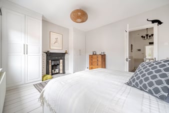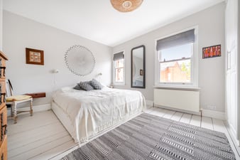 Two sash windows to the front. Painted wooden flooring. Large ornate Victorian style fireplace with tiled inset, a cast iron surround and mantle. Two built-in double wardrobes. Radiator.
