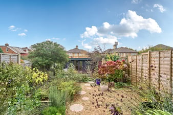 Well screened. A large paved area, ideal for entertaining with space for tables and chairs. Steps down to a pebbled area with an abundance of mature flower beds and pots displaying beautiful colours. Additional wide steps leading to another paved patio area with further seating. Ideal for relaxation. Tall wooden fence panel surround.