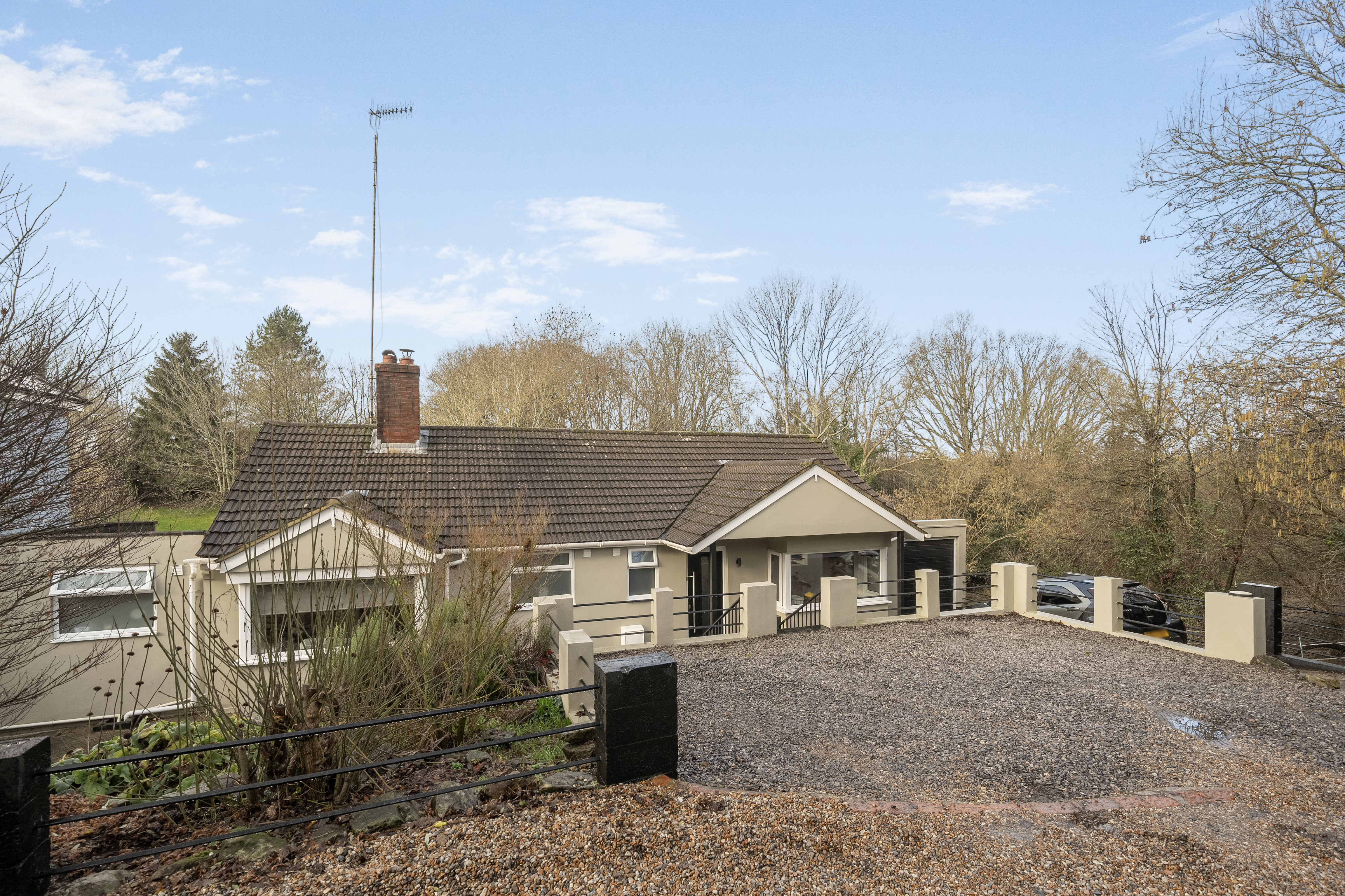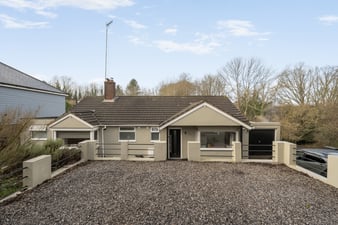 Large standing area to accommodate at least two cars. Steps down to attractive 'herring bone' design paving to the front of the house. A well established rockery abundant with mature shrubs and small trees. A continuation of the driveway which accommodates a further two cars down to a single garage.