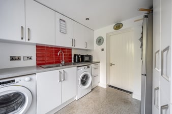 Full glazed door to rear garden. Polished concrete flooring. Work top housing a stainless steel sink unit with drainer. Plumbing for washing machine. Space for dryer. A range of eye level and base storage units. Door to: