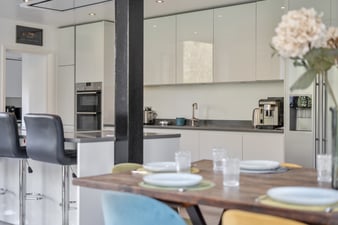 One set of triple bifold doors and one set of double doors, all at extended height, to rear garden. Polished concrete flooring with under floor heating. Large central island with quartz work top housing an induction hob with extractor fan above. Space for four bar stools. An abundance of eye level and base soft closing cupboards and deep drawers. Pull out 'power point'. Built-in double electric eye level oven. Deep stainless steel sink with drainer. Space for an American style fridge freezer with drinks dispenser. Under stairs storage cupboard.
